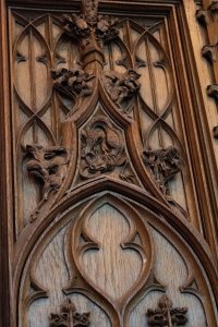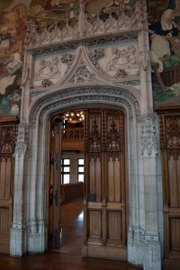 Nous avons poursuivi par la visite guidée de l’Hôtel de Ville avec ses trois grandes salles (la salle du Conseil, la salle des mariages et la salle des fêtes). Toutes trois bien différentes, le bois y est fort présent particulièrement dans la salle des fêtes ornée de dizaines de panneaux sculptés.