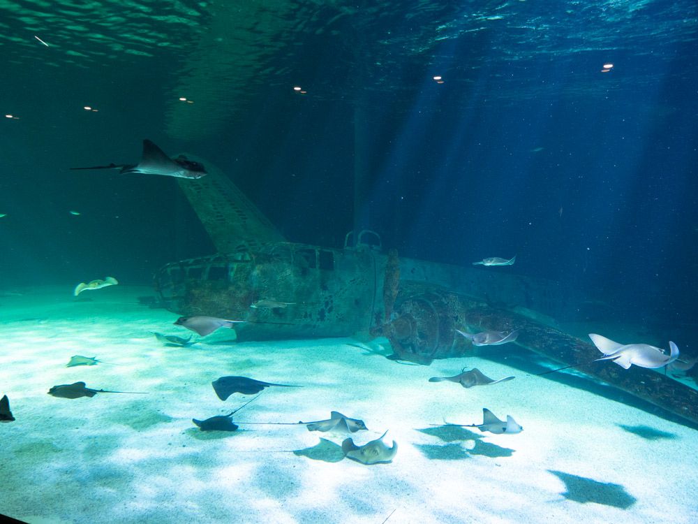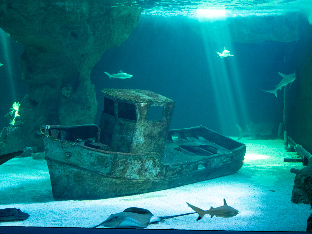 Nous découvrons ensuite un énorme aquarium où divers requins 🦈, tortues et raies se baladent. Les décors sont splendides. L’aquarium fait 18 mètres de long et 14 mètre de large !!
