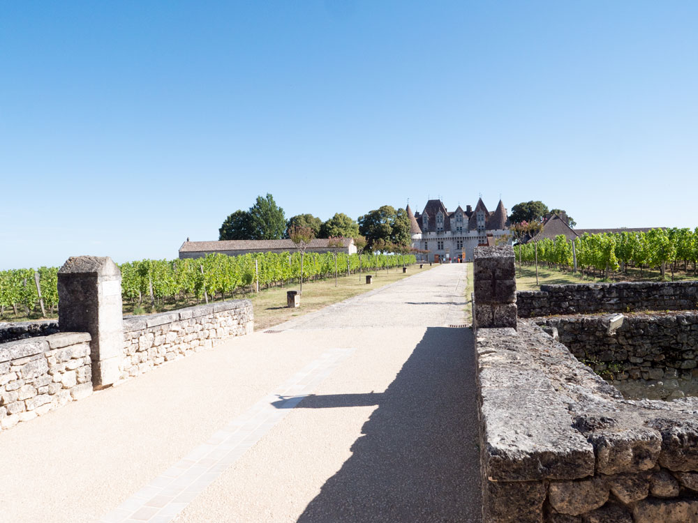 Une fois passĂ©s par l’accueil, nous entrons dans le domaine et dĂ©couvrons les vignes le long du chemin et au bout se trouve le chĂąteau.