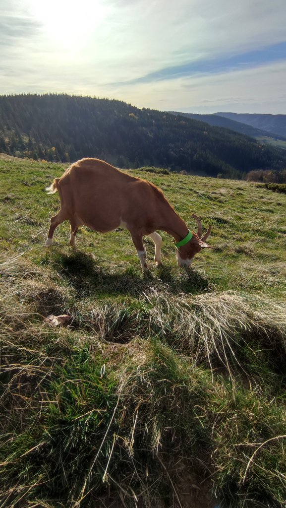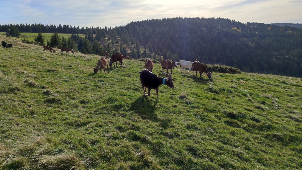 Nous sommes partis du parking au pied du Petit Ballon et commençons notre balade avec les chĂšvres en libertĂ©. Un bonheur đ Elles se fichaient complĂštement des touristes qui cherchaient au mieux Ă les prendre en photo đ Avec leur cloche, elles poursuivaient leur chemin comme bon leur semblaient đ le bonheur đ