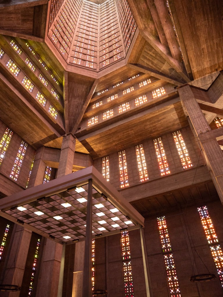 Sa tour fait 107 mètres de haut. Le monument comporte de très nombreux vitraux de Marguerite Huré.